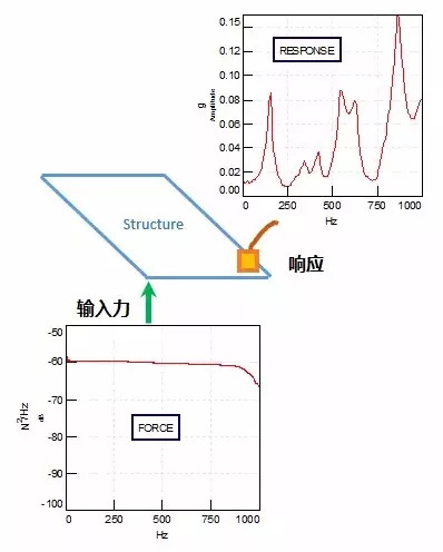 在引线键合机中,高速运动的机械模块通常需要测量FRF来进行模态分析。对于机械结构的实验模态分析,通常输入是力,输出是加速度,速度或位移。如下图所示。对于一个结构件,可以用力锤的方法,作为激励输入,用加速度传感器或者激光干涉仪测量结构的响应
