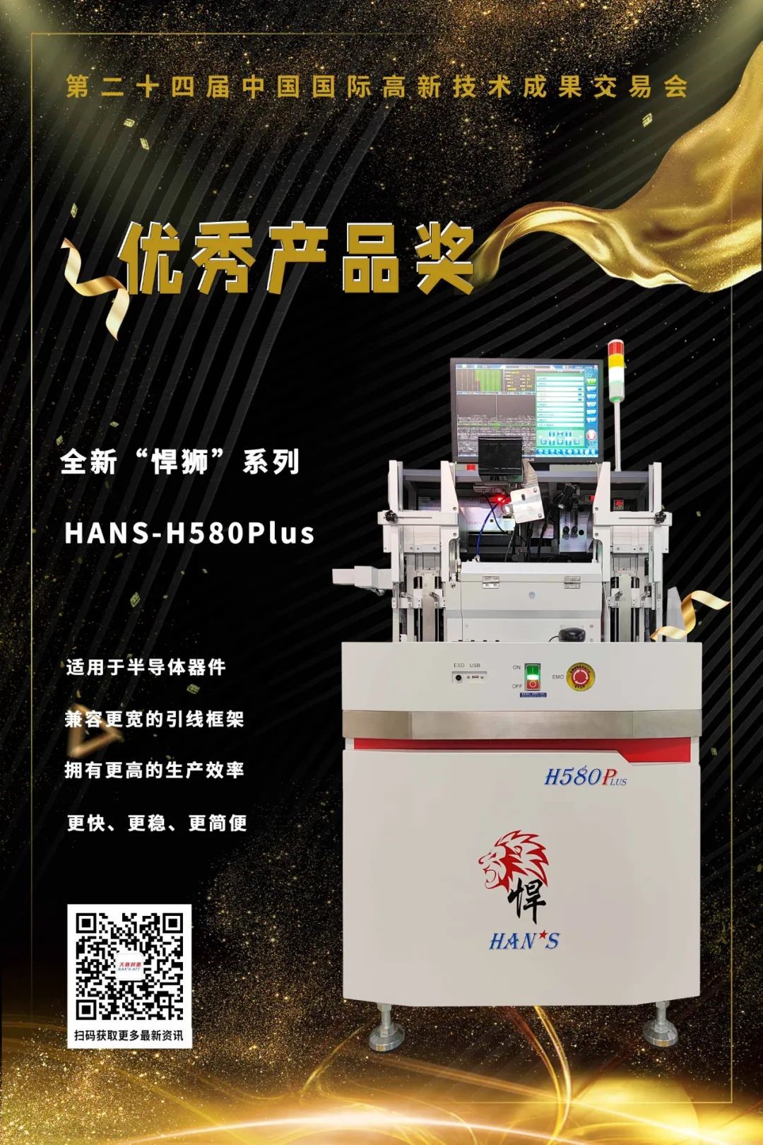 庄闲和游戏封测凭借【“悍狮”系列HANS-H580Plus高速高精度全自动焊线机】摘得第二十四届中国国际高新技术成果交易会“优秀产品奖”,并入选本届“高交会优创展示区”进行展示。